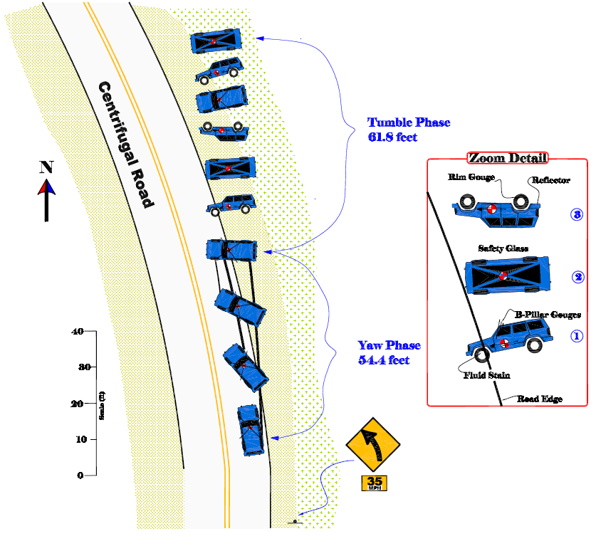 Roll-over drawings are typically shown with the vehicle positioned every 1/4 roll. A detailed view can be shown to explain vehicle to roadway contact (see "zoom detail" below) Evidence such as rim gouges, fluid stains and broken glass reveal the vehicles position and orientation - all of which can be shown on a high-resolution diagram.